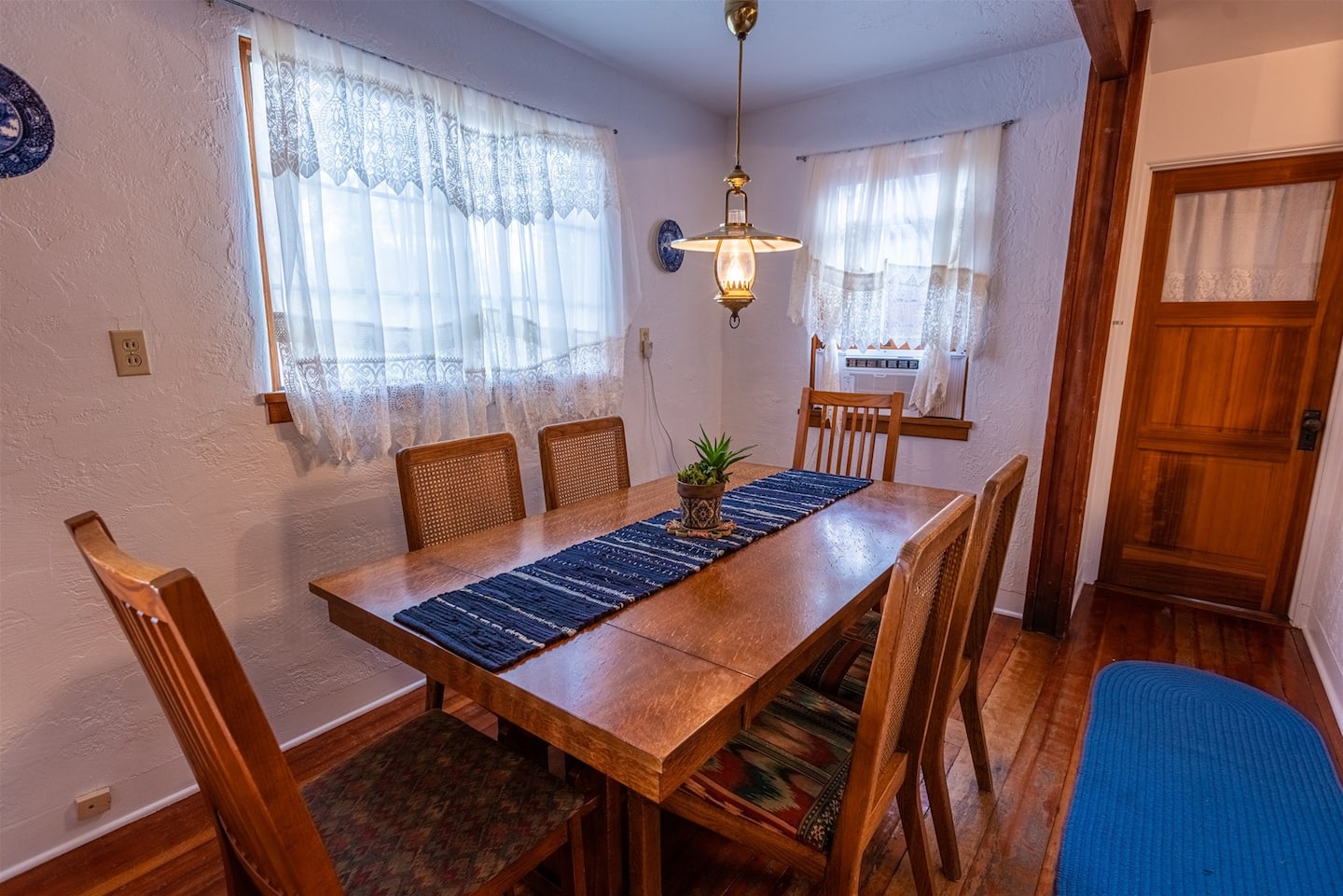 - **Dining Area**: Adjacent to the kitchen, the dining area boasts a large wooden table that comfortably seats six. It's an ideal setting for enjoying meals together or planning your day's adventures.