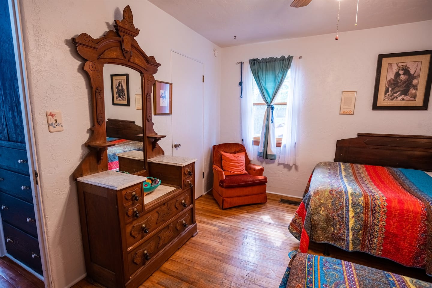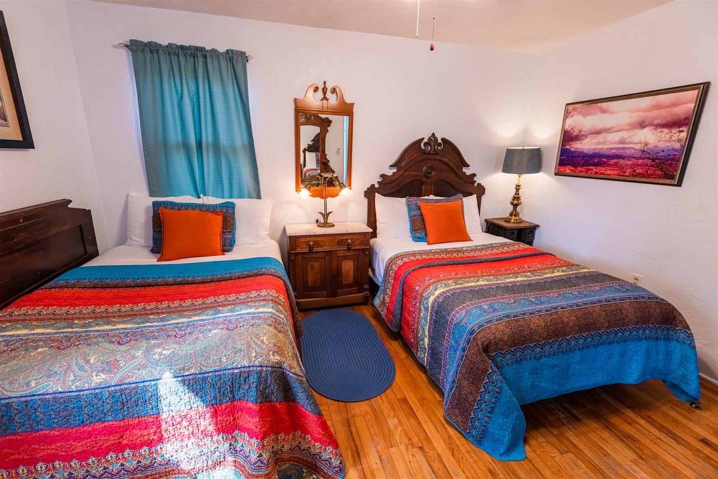 - **Bedrooms**: The house offers two beautifully appointed bedrooms. Bedroom 1 features a comfortable queen-sized bed, while Bedroom 2 includes two double beds, each adorned with colorful bedding and classic wooden furniture.