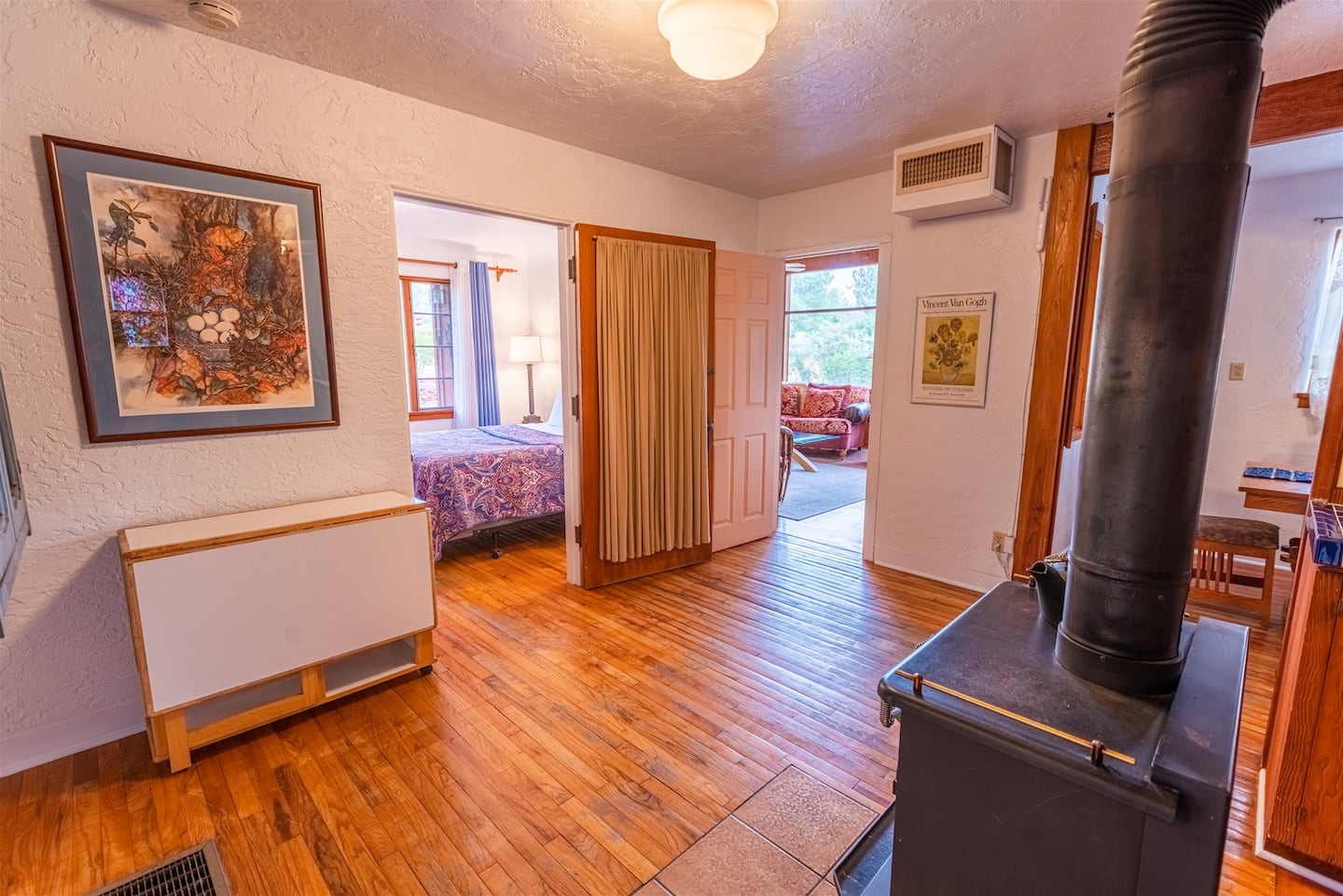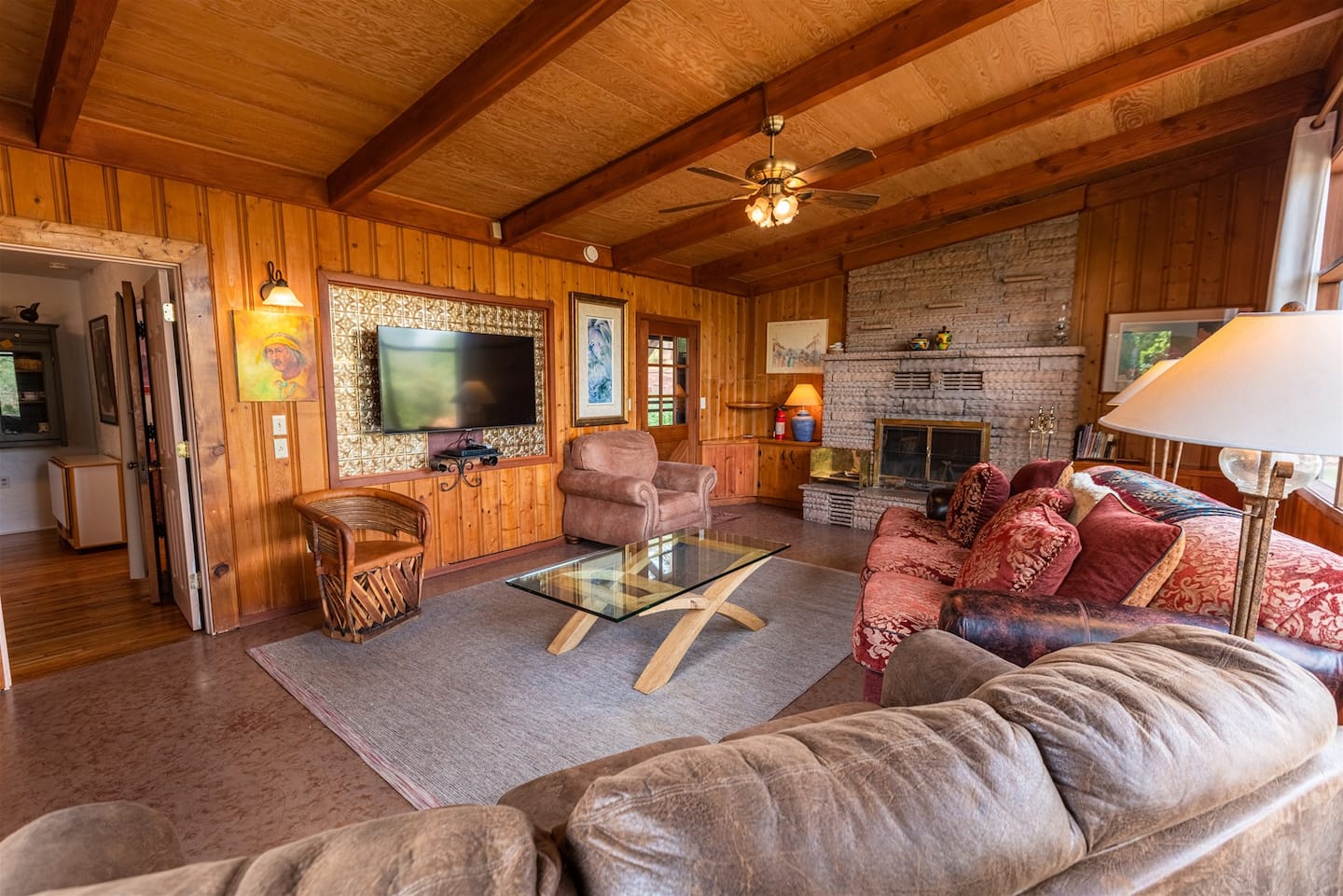- **Living Room**: A cozy space with large windows that flood the room with natural light, offering beautiful views of the surrounding landscape. The wood fireplace adds a touch of warmth and comfort, making it an inviting spot to relax after a day of exploring.