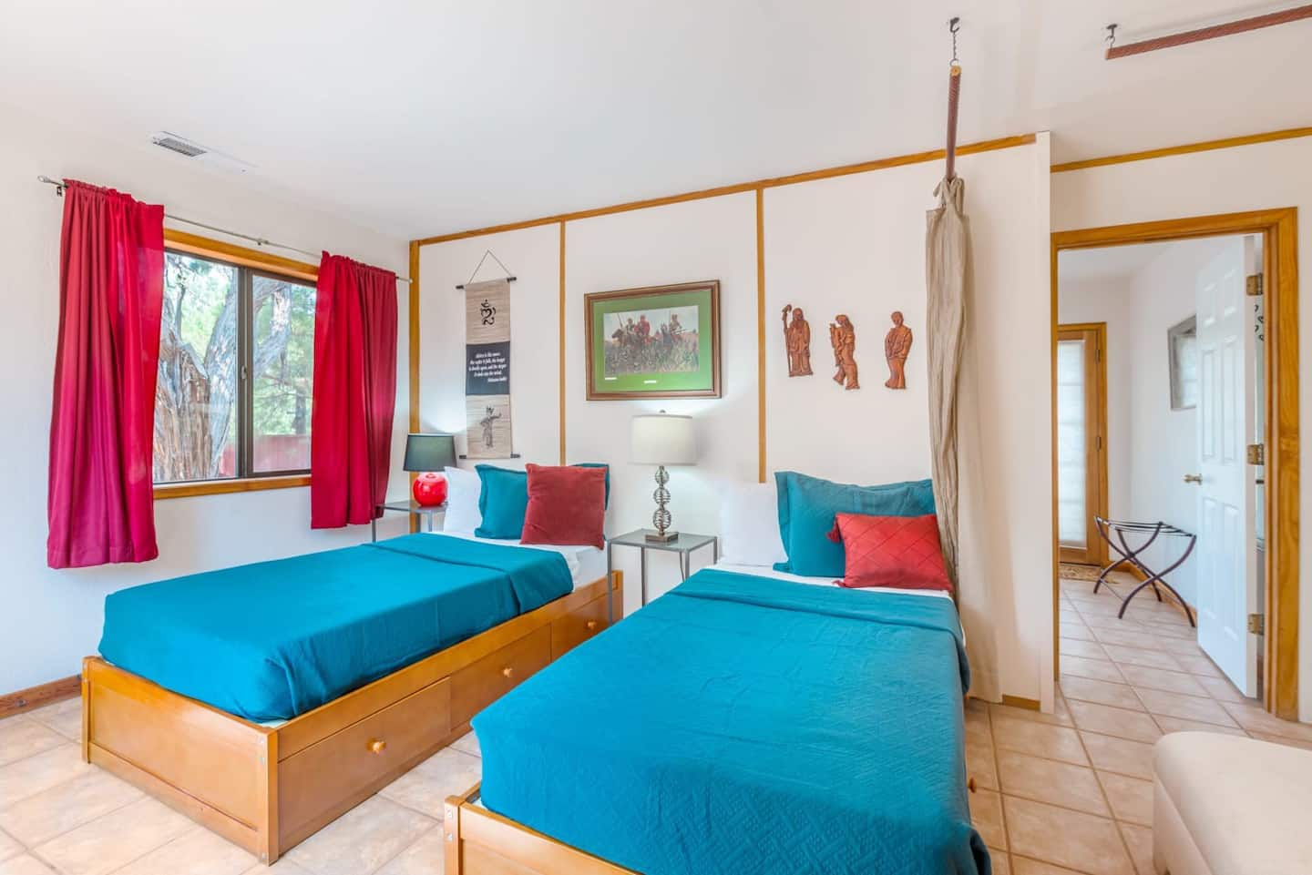 This unique cottage-like space offers a sense of privacy and seclusion, yet is less than 25 minutes to town for groceries and provisions. Views, peace and quiet, and the sounds of Oak Creek babbling close by will ensure you and your group a delightful and rejuvenating experience. The bedrooms in Rainbow Home are the following: