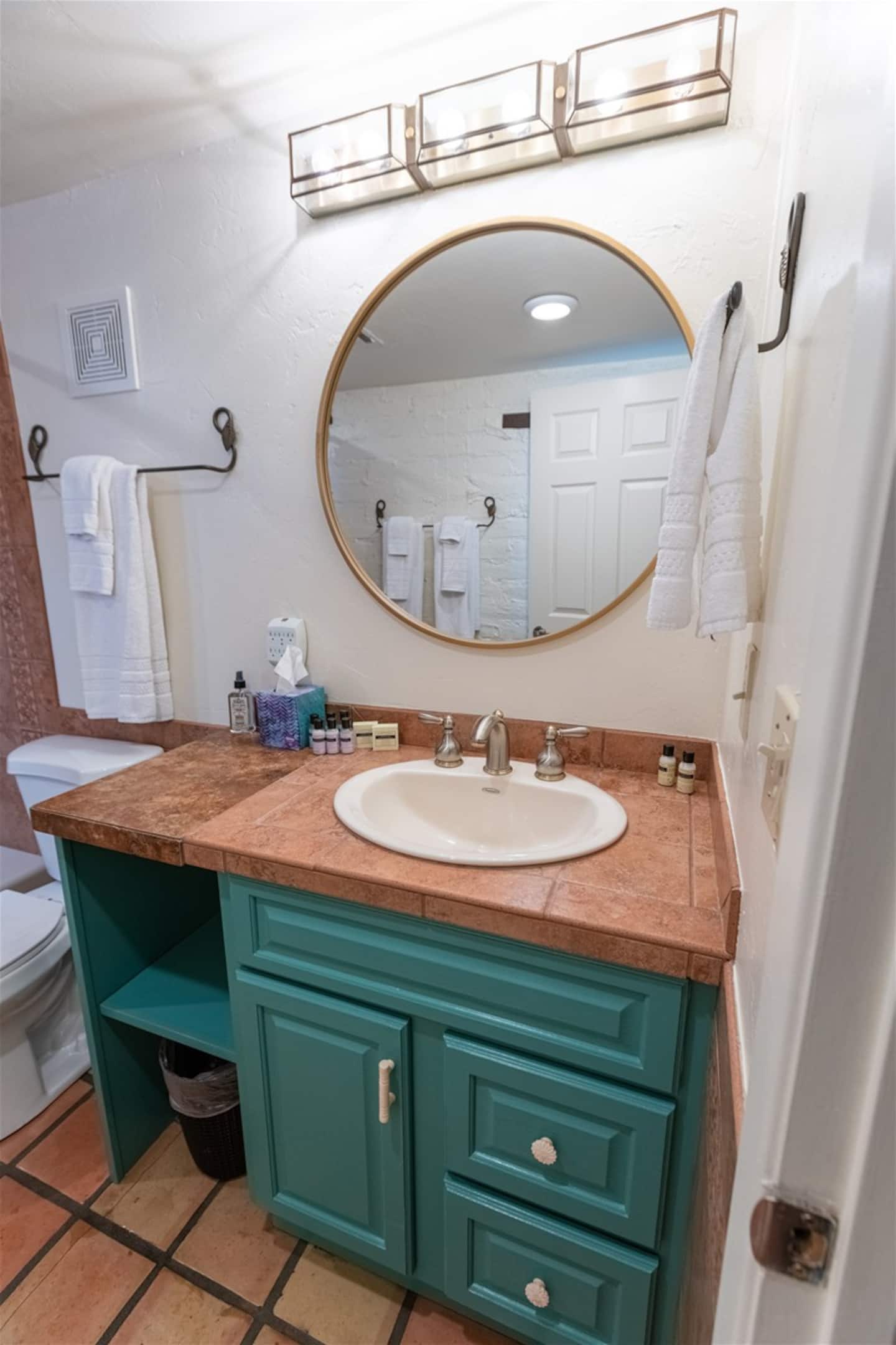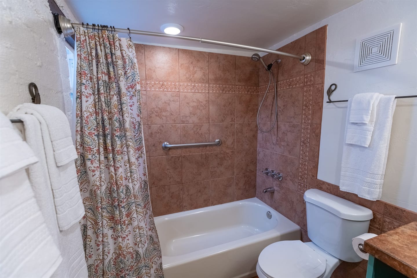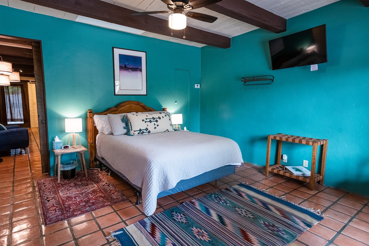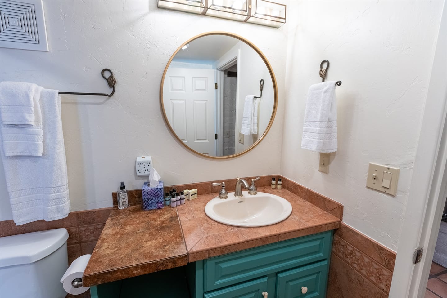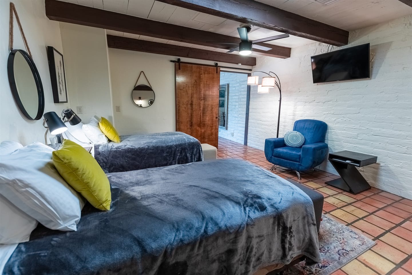 Wonderful stay for family with outdoor seating area. Queen Bed, & 2 Twin beds in adjoining room-sleeps 4. Wifi, Direct TV, and microwave, coffeemaker, hot water tea pot, toaster, and small refrigerator included. Access to use of lawn, outdoor BBQ & Fireplace, Waterfall and Koi Pond.